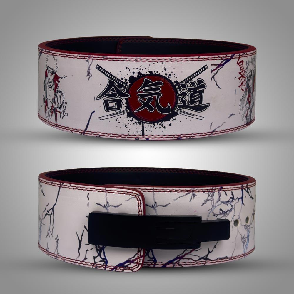 Features traditional kanji characters meaning “strength” and “discipline” flanked by crossed katana swords. The white marble base with red/blue lightning patterns symbolizes kiai energy in martial arts.