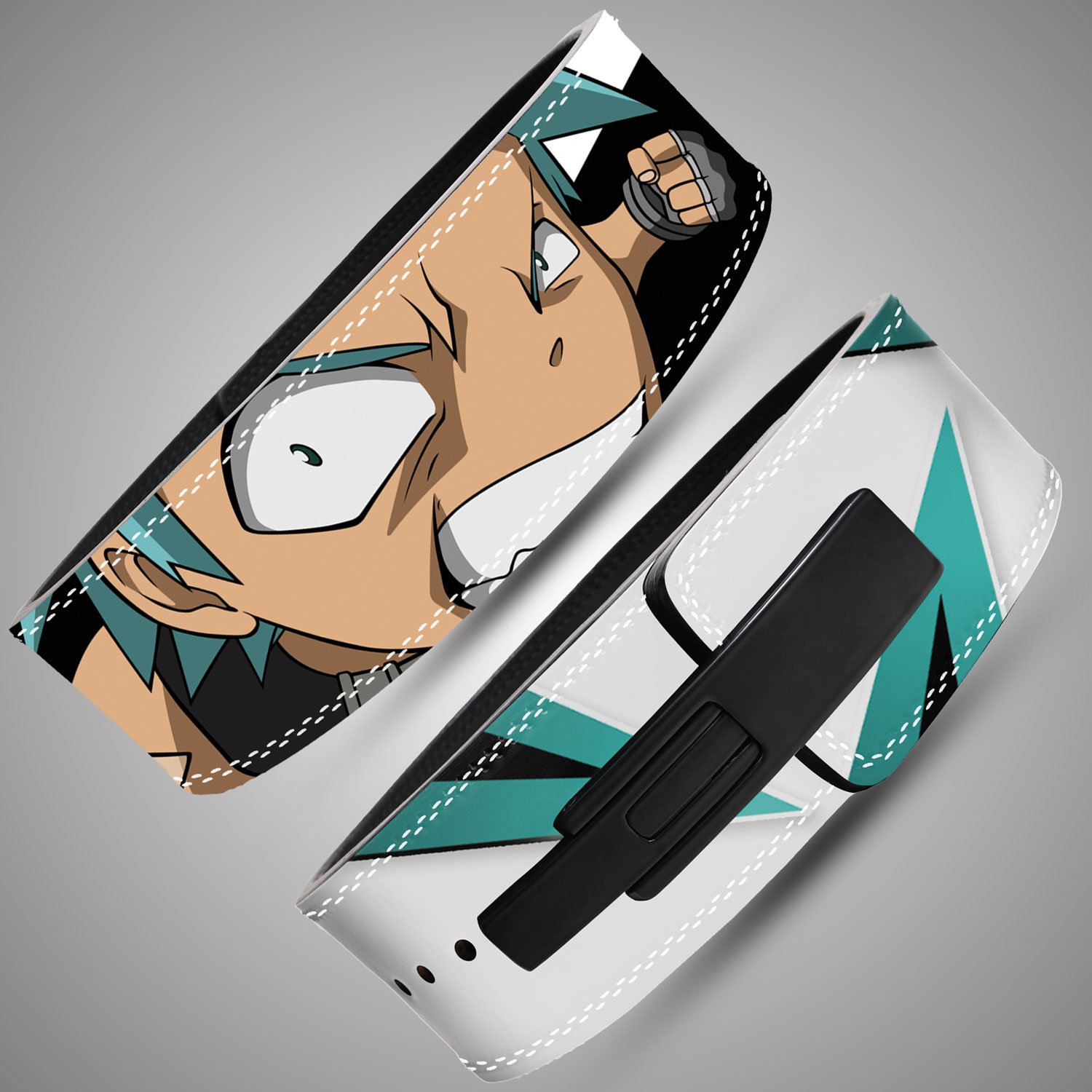 This Black Star anime custom weightlifting belt is built for lifters who push hard in the gym and want a sharp anime look. The artwork shows Black Star in an intense attack pose with teal and white graphic patterns across the belt. Made from strong split leather, it supports your core during squats, deadlifts, bench press, and overhead lifts. Choose from 10mm or 13mm thickness, select your lever style, and add your name to the buckle for a secure and personalized fit.