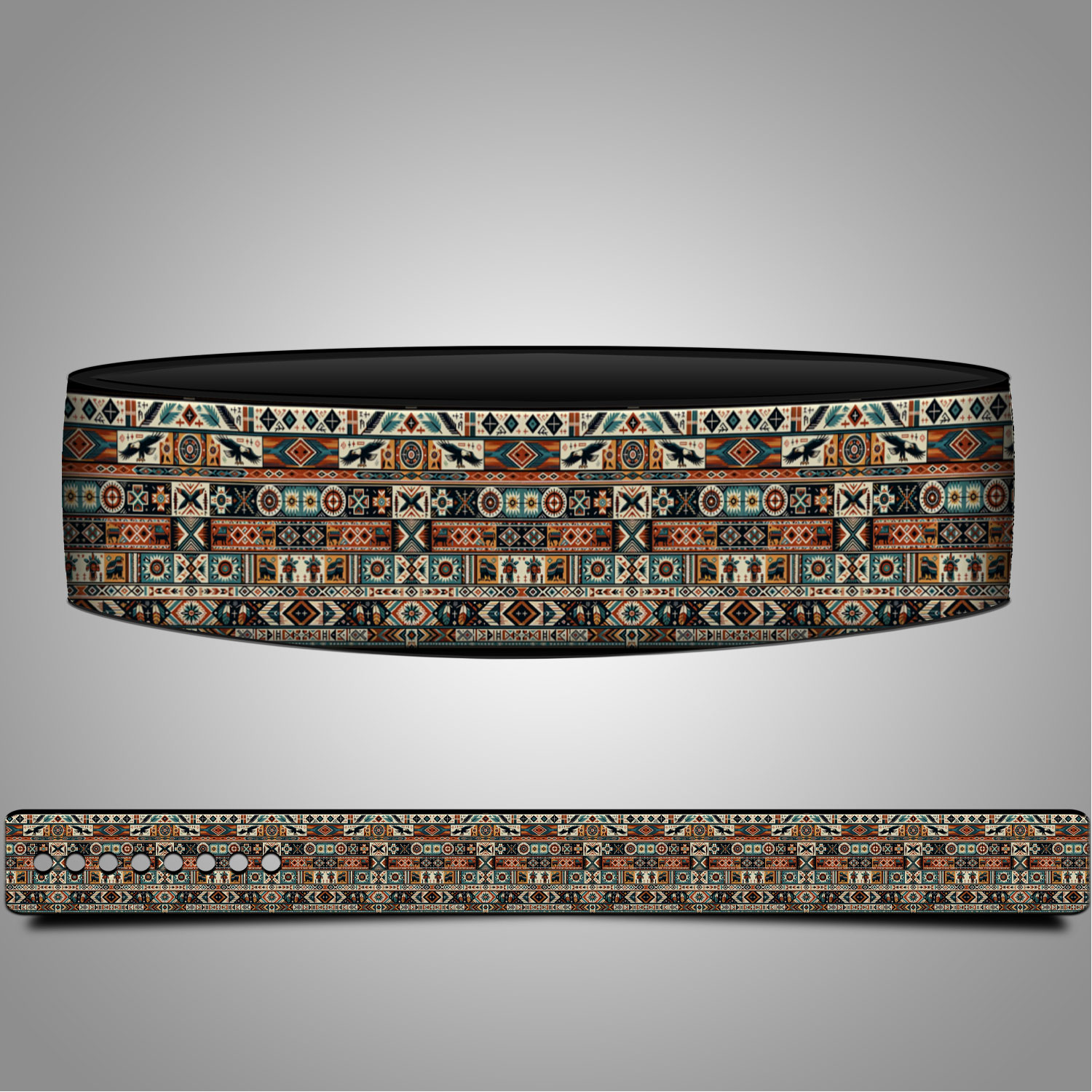 Two Native Power Lifting Belts displayed; each features intricate geometric patterns inspired by Native American designs in orange, turquoise, black, and beige. The top belt shows its black top, while the lower belt is fully extended to display the band’s colorful pattern.Native Power Lifting Belt