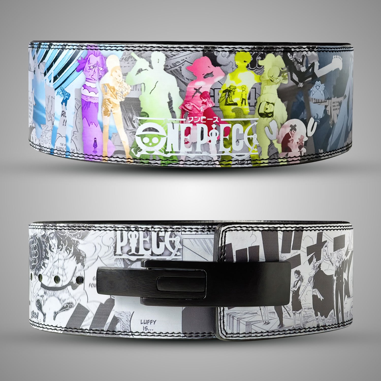 One Piece Weightlifting Belt featuring colorful anime characters and manga-style artwork.One Piece Anime Weightlifting Belt